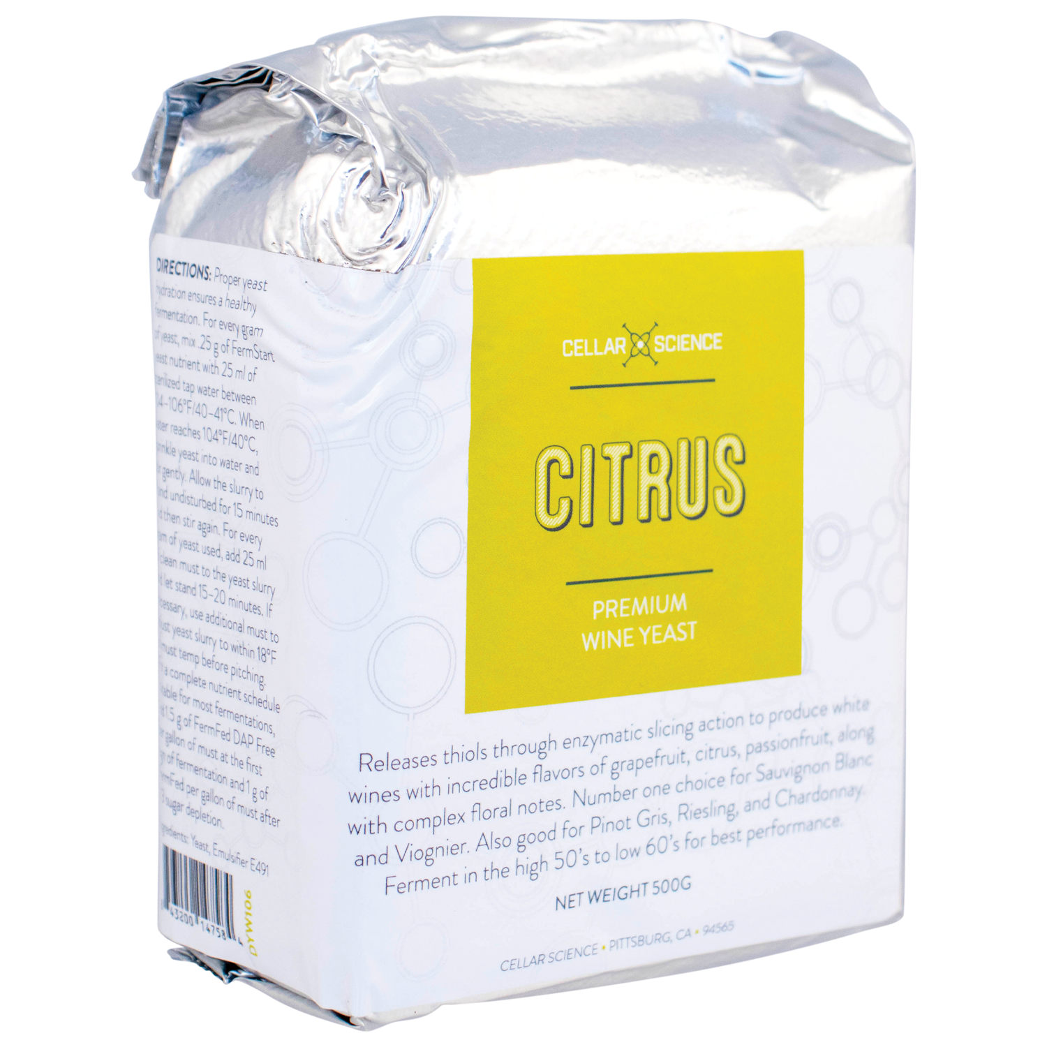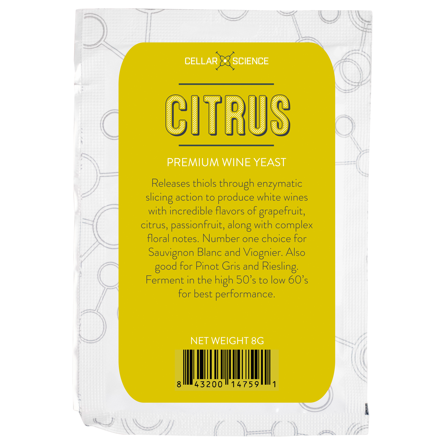 Oh thiols, you elusive magical compound. Nice try hiding behind Cysteine-4mmp, but CITRUS sees you. Cleaving thiols from other compounds is what CITRUS does, releasing the classic citrus, lime, passionfruit, and floral flavors that help separate styles like Sauvignon Blanc and Viognier from ordinary white table wine. Also can be used with Chardonnay , and other whites, and is great for Rose. CITRUS can ferment at cooler temperatures but the enzymatic cleaving activity is highest at around 56-60°F. So if you like Zesty Grapefruit, lime, lemon peel, floral, and passionfruit flavors, CITRUS may be your yeast. This yeast is good at preserving acidity, so if you are working with whites from a warmer region, can be particularly helpful.