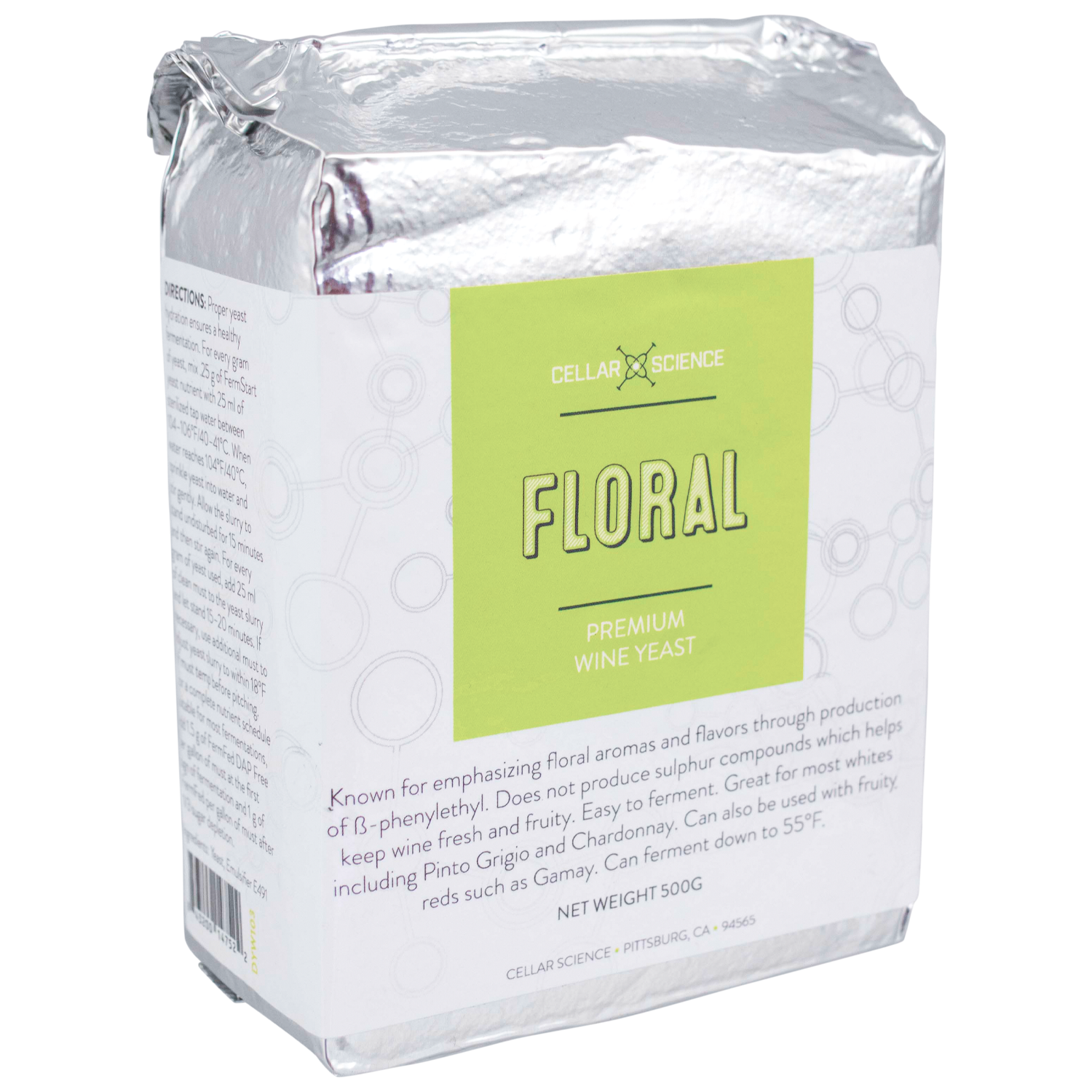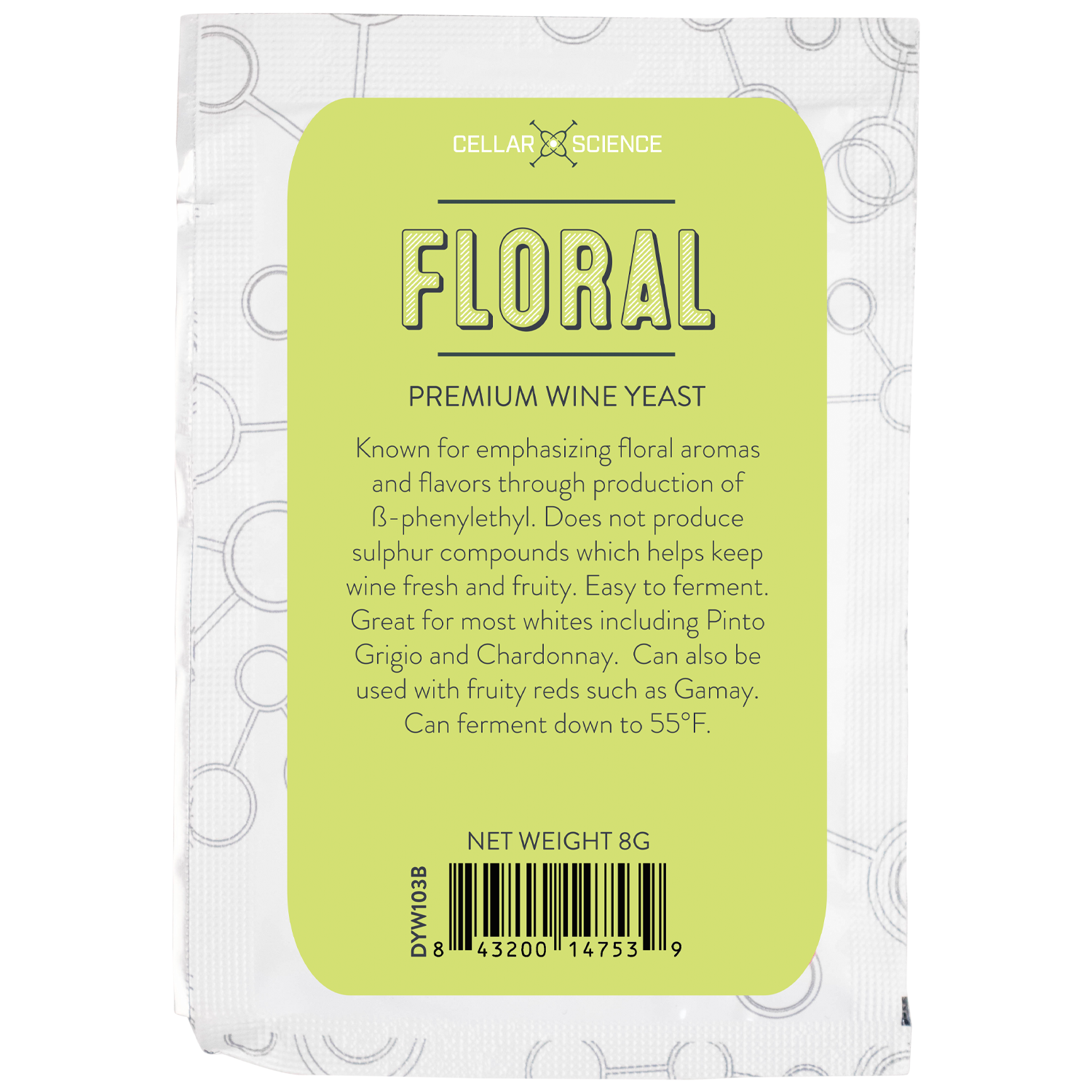 FLORAL is a natural hybrid between Cerevisiae and Bayanus allowing it to ferment at lower temperatures. Its famous for producing a wide range of flavors to add depth and complexity to any wine. FLORAL cannot assimilate sulfur which greatly reduces H2S making it an easy yeast to see through fermentatoin. Low H2S and volatile acidity part of the secret to emphasizing fresh fruit flavors. The production of phenylethyl alcohol and its derivative ß-phenylethyl adds sweet floral notes. Phenylethyl alcohol also helps extract thiols due to their similar polarity, contributing even more to citrus and floral flavors. A hugely aromatic yeast that is easy to ferment. Great for any whites or fruity reds where a floral charateristic is desired. First choice for Italian whites like Pinot Grigio. Can ferment down to 55°F.